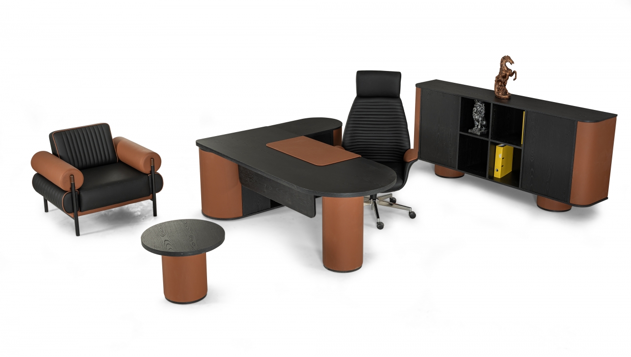 NOVA Masa - Üst tabla 18+18 mm Myl Deri kaplamalı Etajerde 3 çekmeceli Bas Çek komodin ve Dolap |